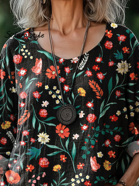 Garden Floral And Butterfly Pattern Printed Women's Casual Cotton And Linen Shirt