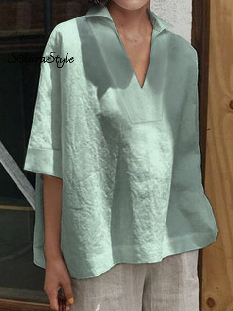 Women's V-neck Cotton And Linen Solid Colour Loose Mid-Sleeve Shirt